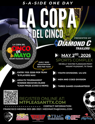 Diamond C Trailers proudly presents the Cinco de Mayo Men's, Co-Ed & Youth Soccer Tournament – an action-packed 5v5 competition where only the best will rise to the top! ⚽💥